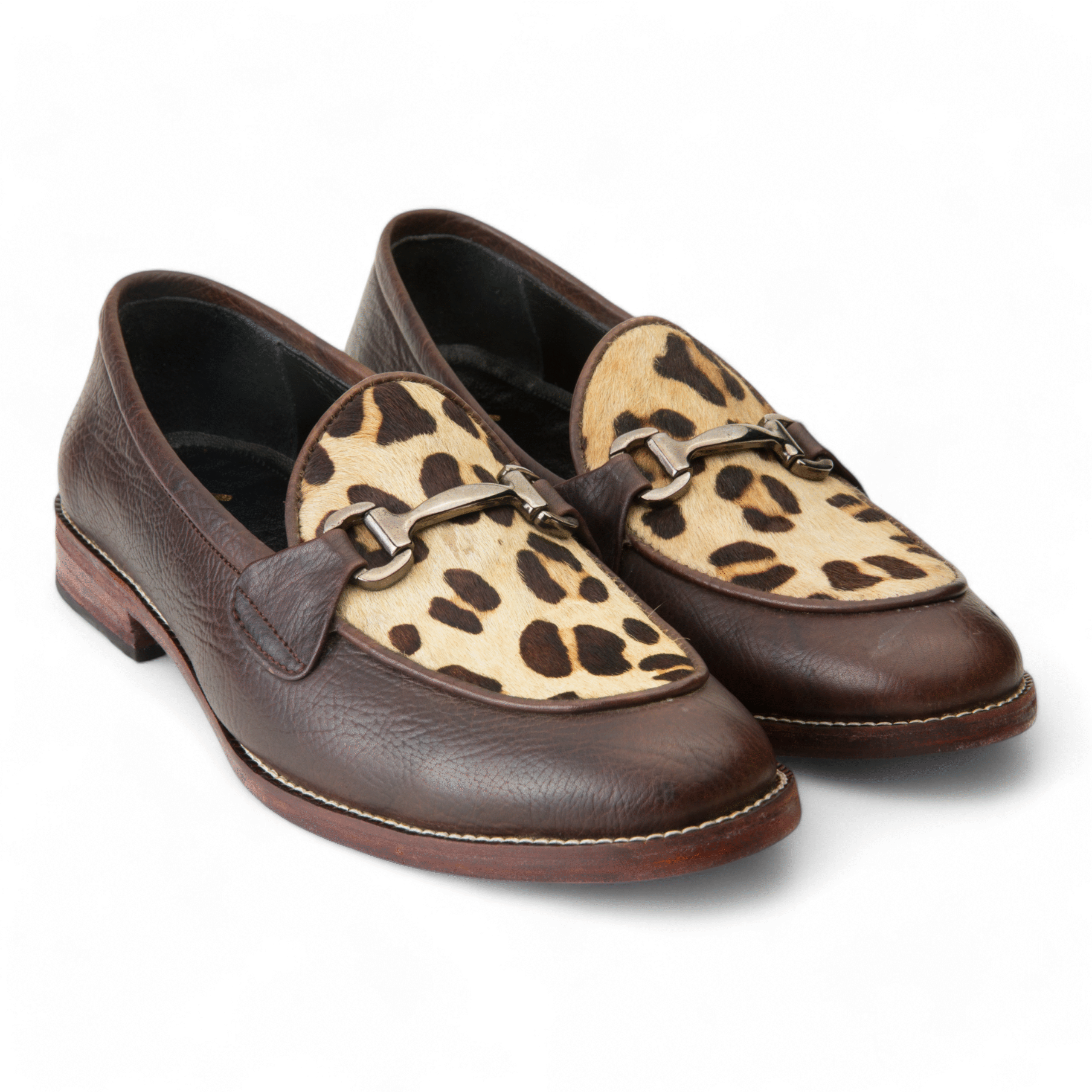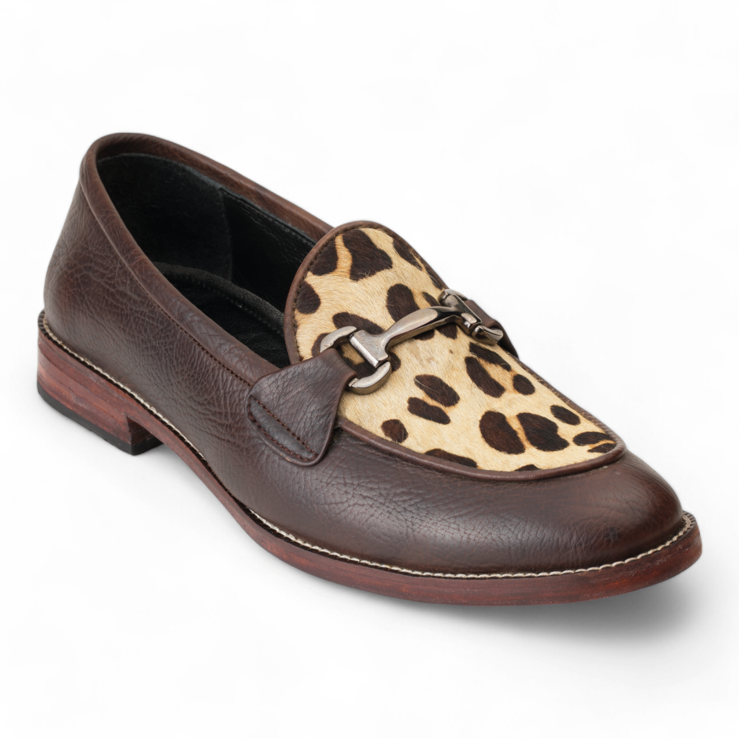 Premium leather loafer with hair-on leather vamp and metal horsebit detailing.